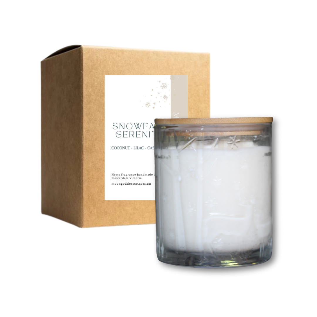 Featuring a unique snowflake wax design top, this candle is housed in an intricately designed glass vessel showcasing reindeers and snowflakes nestled among winter woods, and finished with a natural bamboo lid.