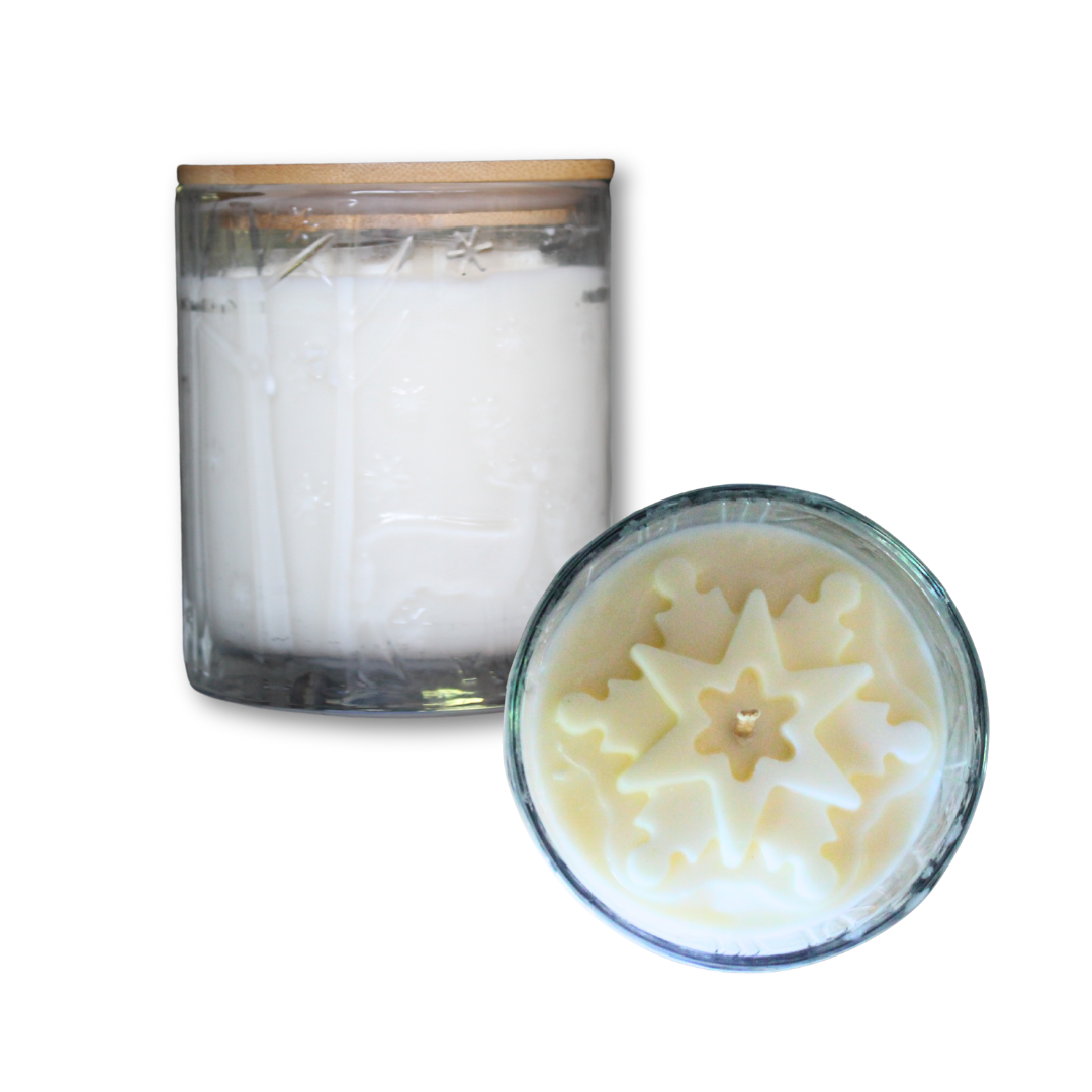 Featuring a unique snowflake wax design top, this candle is housed in an intricately designed glass vessel showcasing reindeers and snowflakes nestled among winter woods, and finished with a natural bamboo lid.