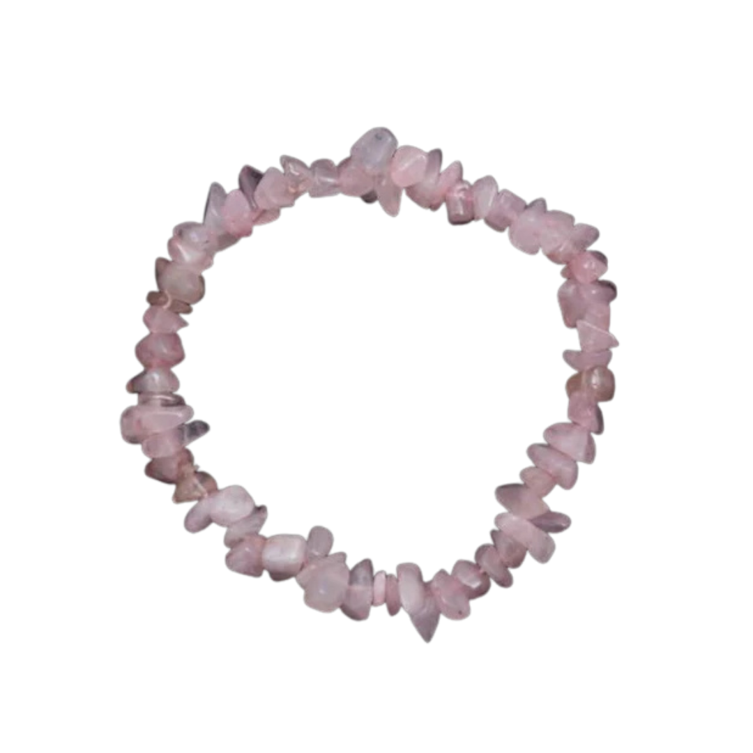 Made with natural rose quartz chips, this bracelet features soft pink hues that bring a gentle, feminine touch to any look. Each stone’s natural variation makes every piece unique, adding subtle beauty and charm to your collection.