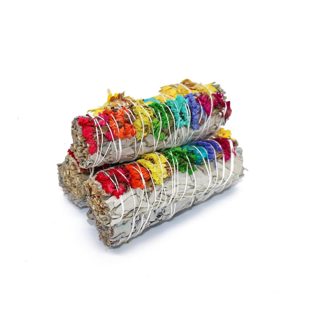 Infused with the energy of the seven chakras, this smudge stick is crafted with pure white sage wrapped in a rainbow of florals. White sage clears stagnant energy, while the colors of the rainbow align and balance your energy centers bringing harmony to mind, body, and spirit.